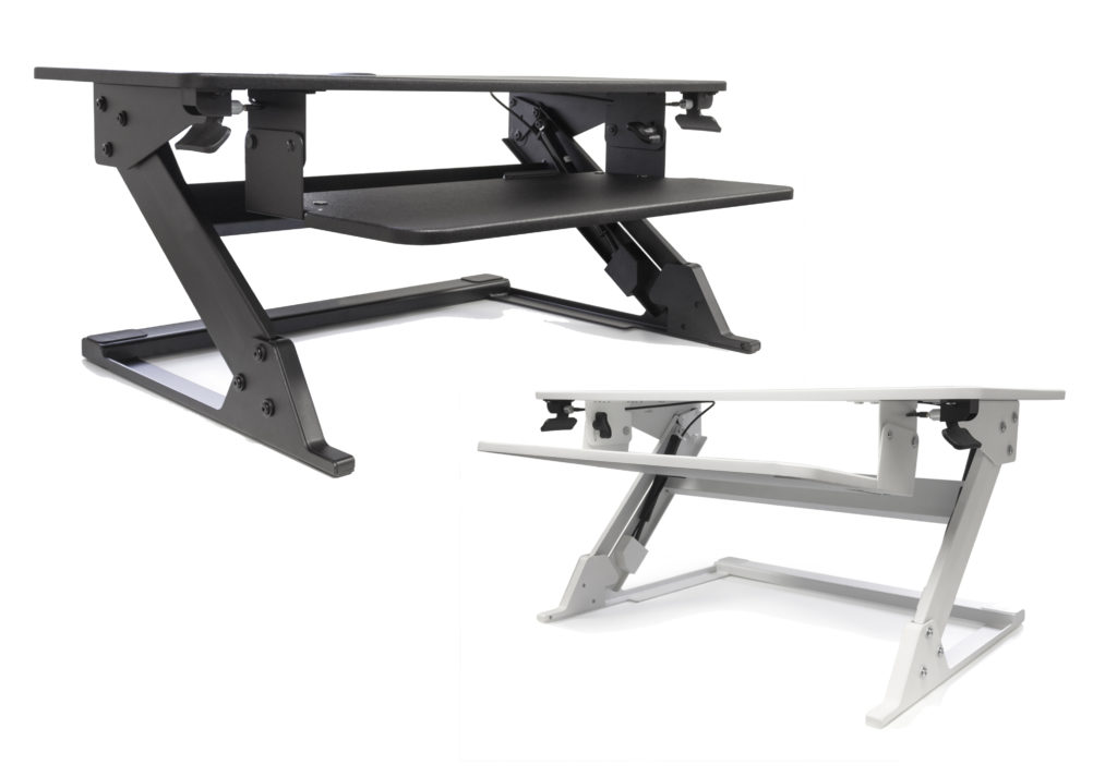 Système offrant une solution simple et économique pour convertir une table de travail en un poste de travail assis-debout. S’ajuste facilement et rapidement avec une légère flexion des poignets. Possède une grande surface de travail solide et stable. Possède une surface séparée pour le clavier et la souris. Surface de MDF. Ne nécessite aucun assemblage. Disponible en blanc ou en noir.